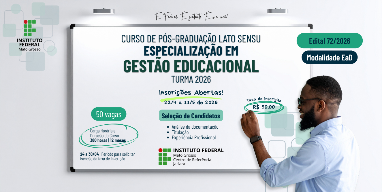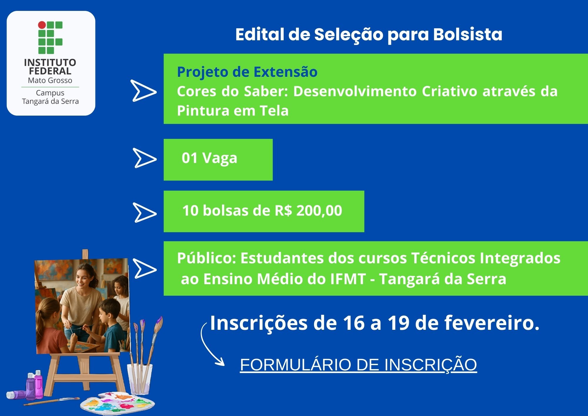 O Instituto Federal de Educação, Ciência e Tecnologia de Mato Grosso – Campus Tangará da Serra torna pública a abertura de inscrições para seleção de bolsista para atuação no Projeto “Cores e Saberes”, conforme disposto no Edital nº 01/2026